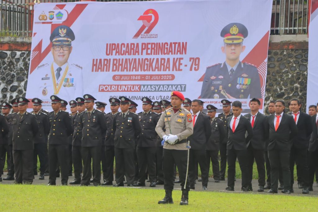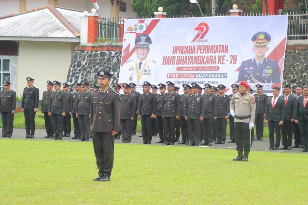 Sambutan Kepala Kepolisian Negara Republik Indonesia, Jenderal Polisi Listyo Sigit Prabowo yang dibacakan oleh Kapolres Minahasa utara AKBP Auliya Rifqie A. Djabar, S.I.K. M.Si. mengatakan, Puji dan syukur kita panjatkan kehadirat Tuhan Yang Maha Esa, karena atas rahmat dan karunianya, pada hari ini kita dapat memperingati Hari Bhayangkara ke-79 dalam suasana yang penuh khidmat dan semangat kebangsaan.