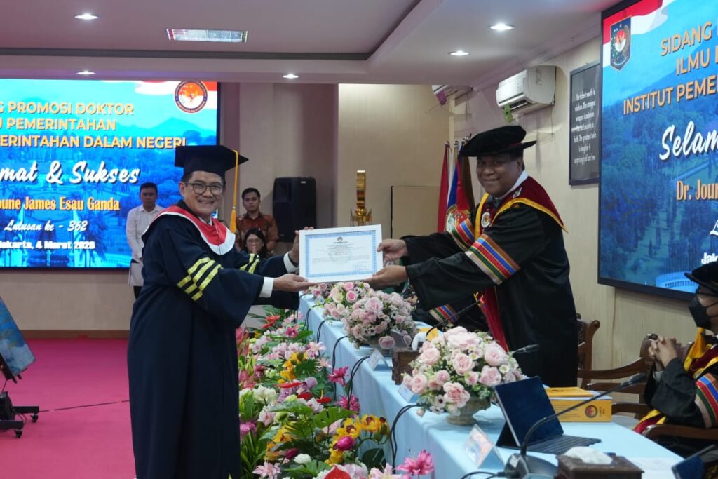 Menariknya, Joune Ganda yang sebelumnya telah dianugerahi gelar Alumni Kehormatan IPDN pada 2021, kini resmi menjadi bagian dari alumni secara akademis. Dengan semangat “Bhinneka Nara Eka Bhakti”, ia berkomitmen untuk terus mengintegrasikan pengalaman praktisnya sebagai kepala daerah dengan landasan ilmiah demi kemajuan bangsa.