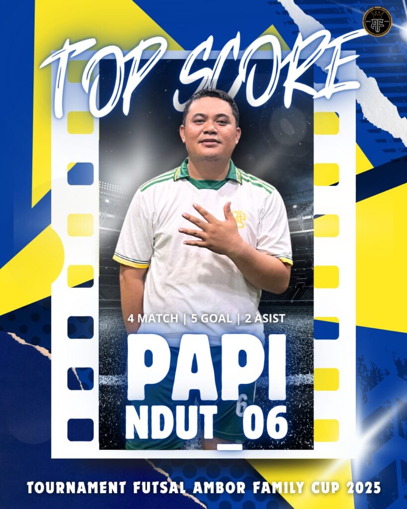 Adapun pencetak gol terbanyak atau top skor yang diraih oleh pemain dari Tim Singa Muda Papi Ndut dengan 5 Gol, ada juga pemain terbaik Dari Tim Anomali FC Johan Lumihi, kiper terbaik Ahmat Abudi.