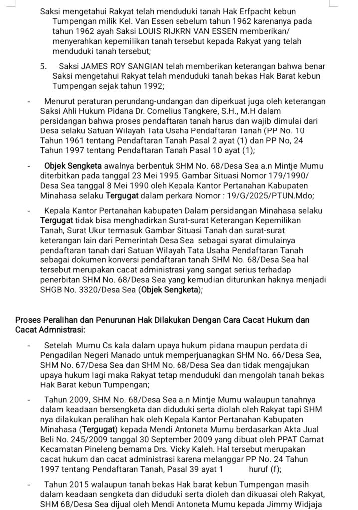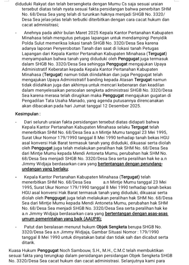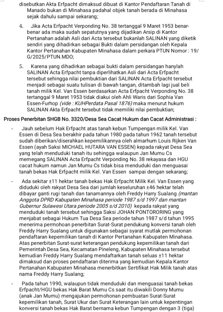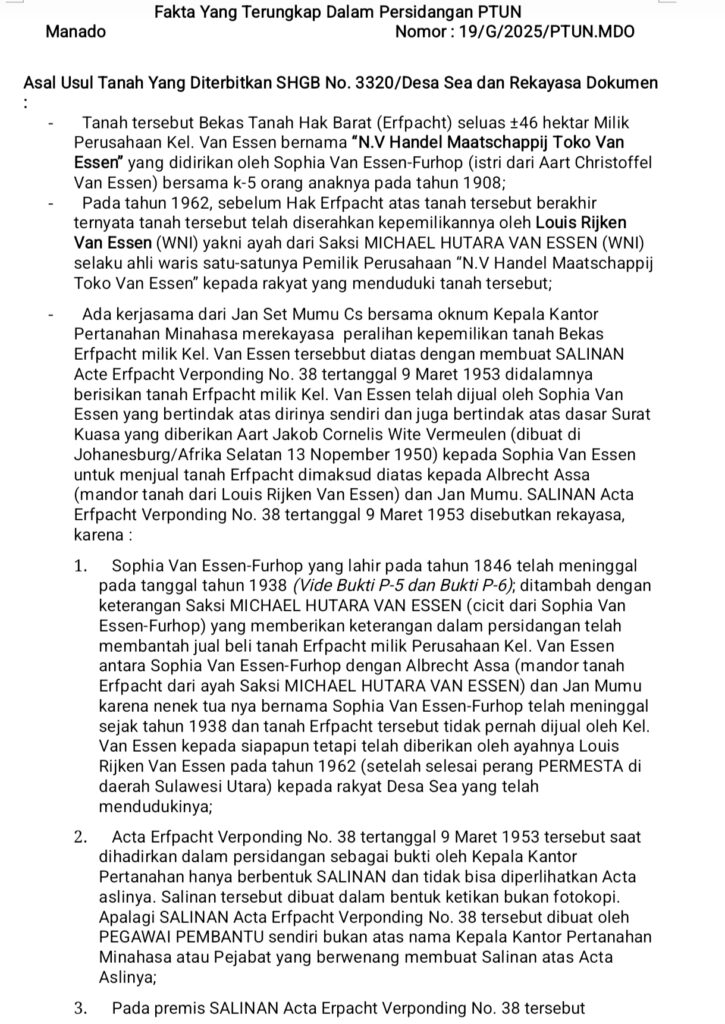 “Kami juga berharap Majelis hakim yang memeriksa perkara ini untuk berhati-hati jangan sampai terkecoh dengan salinan akta erfpacht yang diajukan BPN Minahasa sebagai bukti,” sambungnya.