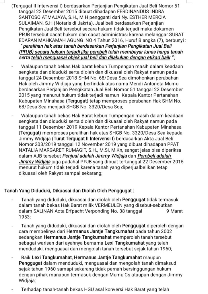 Gugatan ini dilayangkan guna menguji kebahsahan Sertifikat Hak Guna Bangunan (SHGB) 3320/Jimmy Widjaja. Ironinya BPN Minahasa niat hati ingin membuktikan bahwa SHGB 3320/Jimmy Widjaja adalah sertifikat asli dan sah mengajukan bukti-bukti surat akan tetapi malah melakukan blunder fatal.