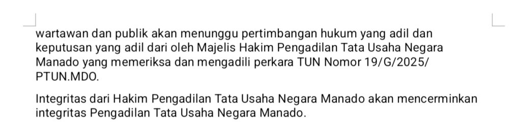 Berikut Beberpa fakta Yang Terungkap Dalam Persidangan PTUN Manado Nomor : 19/G/2025/PTUN.MDO